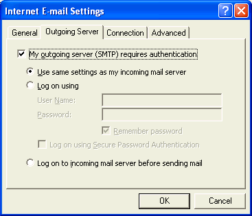 In most cases it is just necessary to set the Server up as shown in the figure. Check the box to indicate Authentication is required and then use the same settings as for the Incoming Mail Server. In some cases you will be given a special User Name and Password which must be entered. This is the case with USP, an ISP commonly used by James Miller.
