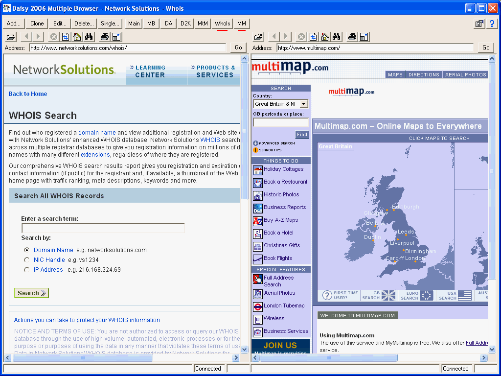 Two Windows Split Vertically This shows two windows arranged vertically. The left shows the very useful Who Is page at Network Solutions and the other the Multimap home page. Both are extremely useful for investigating whether web sites are genuine or owned by crooks. |